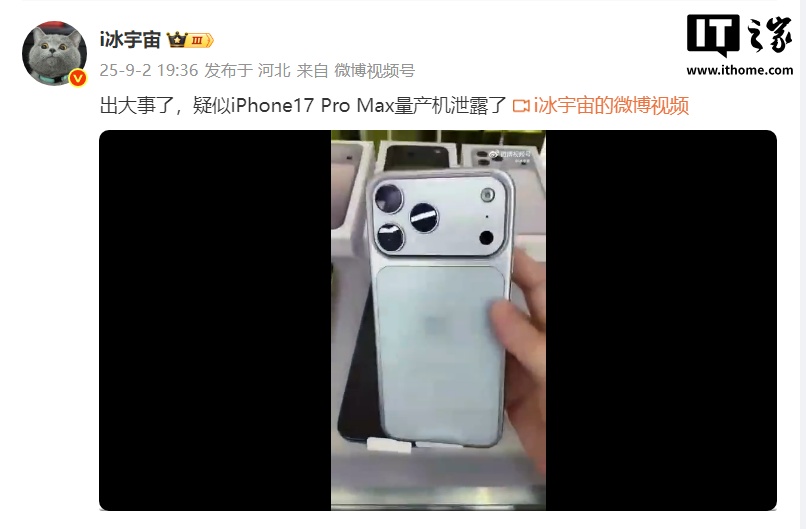 9 月 2 日消息,苹果 iPhone 17 / Pro 系列手机预计将在 9 月 10 日凌晨的发布会上推出,博主 @i冰宇宙 今日晒出视频,称“疑似 iPhone 17 Pro Max 量产机泄露”。