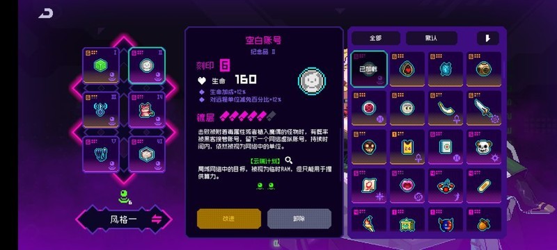 本次升级的紫色纪念品,击杀怪物后可生成虚拟账号,临时提供算力并传递流量攻击,增强了毒2套装对群体的伤害效果,弥补了希尔生成虚拟账号较慢的不足,尤其在面对多个目标的BOSS(如药片之神、阿古斯等)时表现更为突出,已成为半核心装备之一。