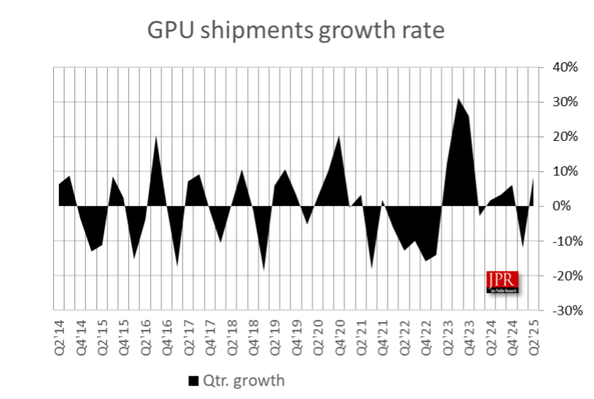 而如果考虑全平台全类型市场,则 2025 年二季度 GPU 整体出货量实现了 4.9% 同比增长,相较十年平均水平提升了 5.2%。此外桌面 GPU 出货同比增长 11.0%、笔记本电脑 GPU 增长 2.5%。