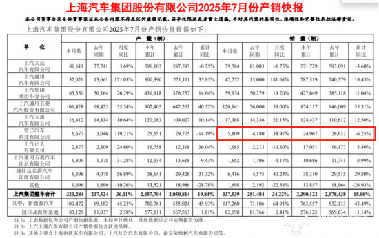 今年前七个月,智己汽车累计销量只有24967辆,同比下滑6.25%,在上汽集团的国内整车业务板块中,智己汽车的销量占比最低,同时也是下滑幅度最高的品牌。按照规划,2025年智己汽车的销量目标为10万辆,如今前七个月目标完成率还不到四分之一,想要实现目标有着很大难度,甚至能不能超过去年的销量都不好说。