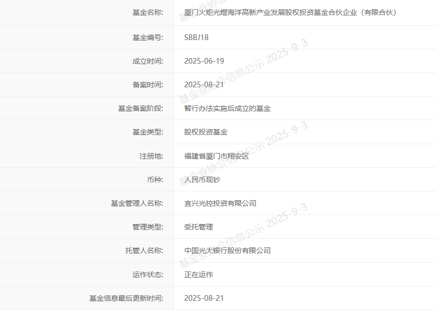 投资界(ID:pedaily2012)消息,近日,由厦门火炬集团创业投资有限公司(以下简称“火炬创投”)主导设立的厦门火炬光煜海洋高新产业发展股权投资基金合伙企业(有限合伙)(以下简称“厦门海洋高新产业发展基金”)正式完成中国基金业协会备案。基金总规模20亿元,标志着厦门在深化海洋经济发展战略,打造蓝色经济新引擎方面迈出重要一步。
