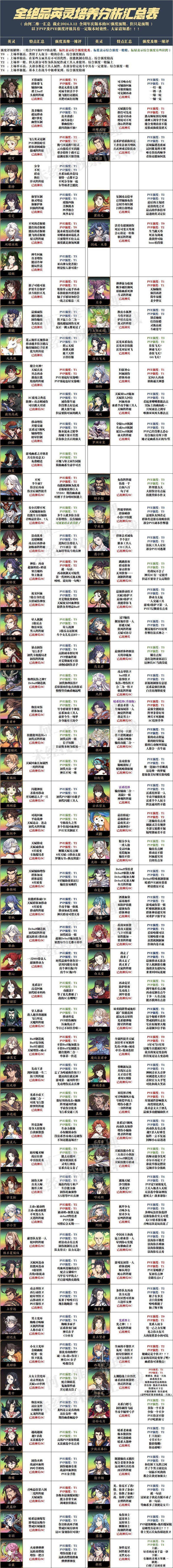 此次更新的完整版表格已在此附上,方便大家收藏备用。若对部分内容或评级有不同意见,欢迎留言反馈,后续版本中将根据建议进行调整。