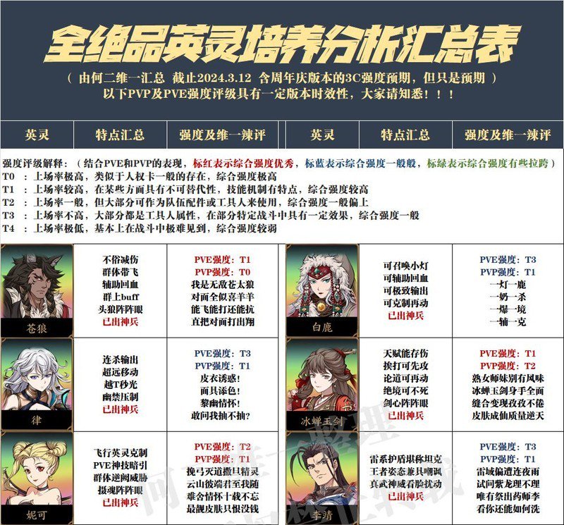 对于不同英灵在双端的评级,维一采用了颜色区分的方式进行标注。若双端评级总和在0到3之间,会以红色标示,表示该角色整体强度较为突出;若在4到5之间,则用蓝色标注,代表其综合表现处于平均水平左右;而总分在6到8之间的则以绿色显示,意味着该角色可能存在某些短板,或整体强度相对偏弱,不过其中也可能存在个别特殊情况,仅供大家参考。