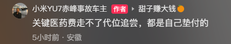 但小米YU7车主也无奈表示,因事故产生的医药费无法通过该方式报销,目前所有伤者的医疗费用均由自己先行垫付。