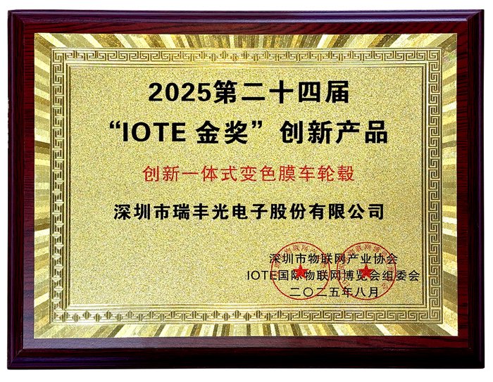 值得一提的是,在展会同期,瑞丰光电“创新一体式变色膜车轮毂”一举夺得双项荣誉,分别荣获2024-2025 年度电子纸创意“首创奖”及IOTE金奖2025创新产品奖(IoT通用产品)。