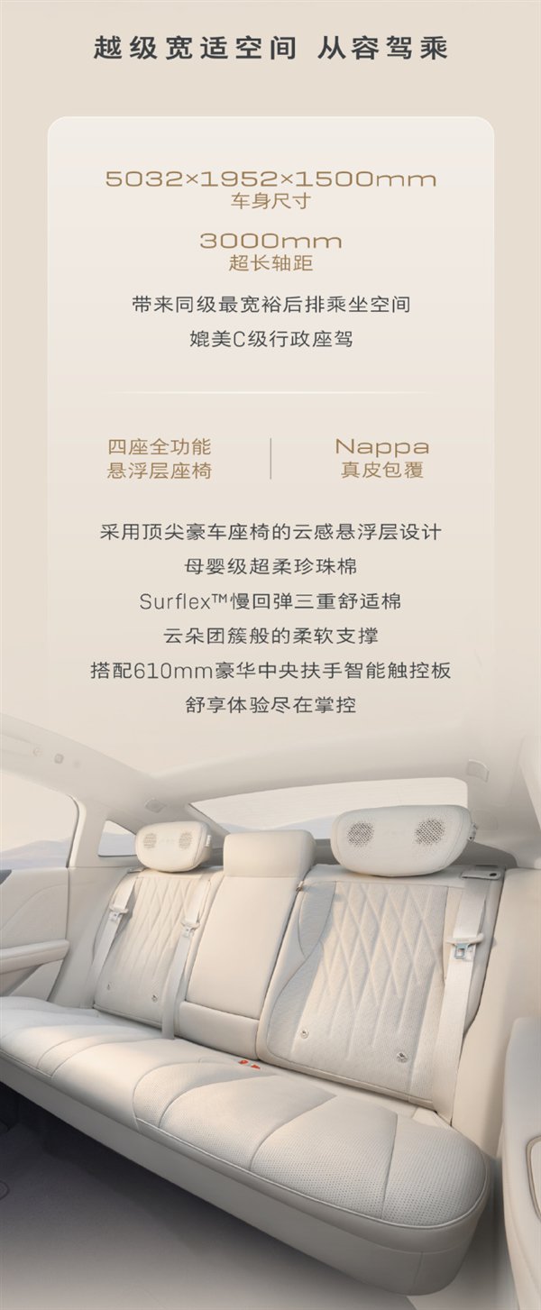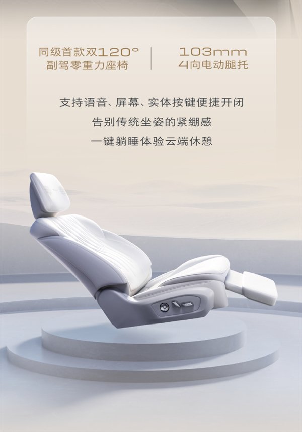 新车搭载四座全功能悬浮层座椅、双120°零重力座椅,配备103mm的四向电动腿托,可通过语音、屏幕、实体按键等多种方式控制,支持“一键躺睡”。