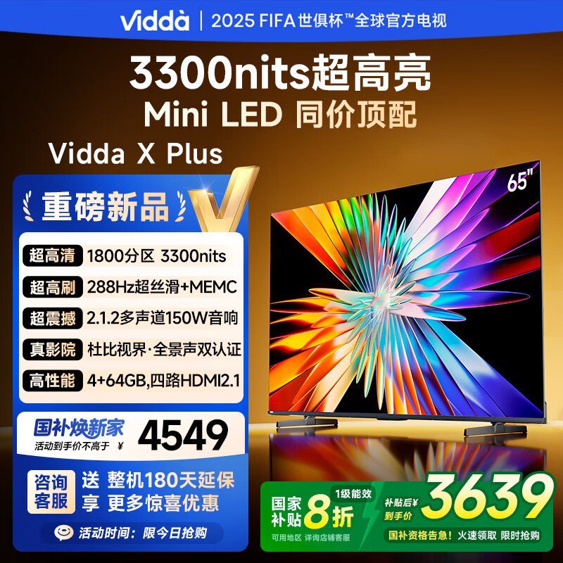 Vidda 65V7R-PRO 65英寸4K液晶电视钜惠价3639元