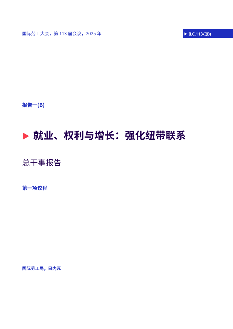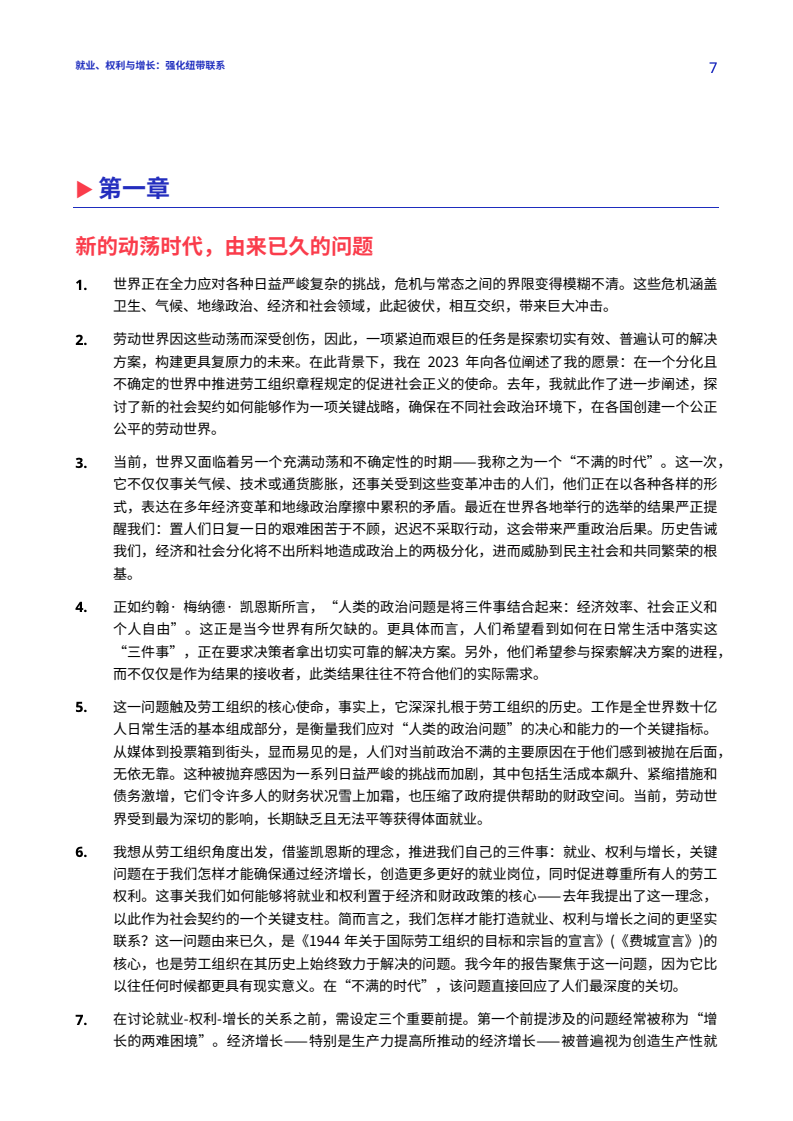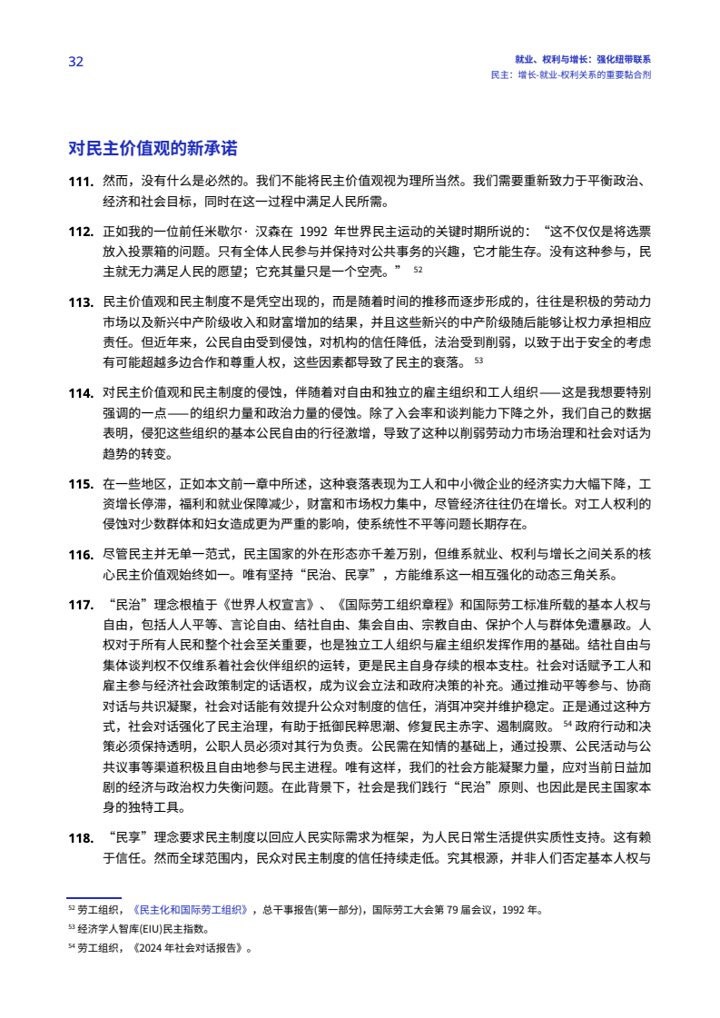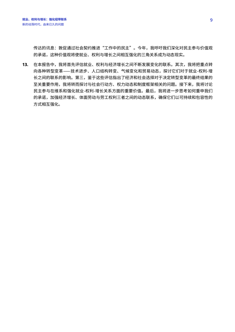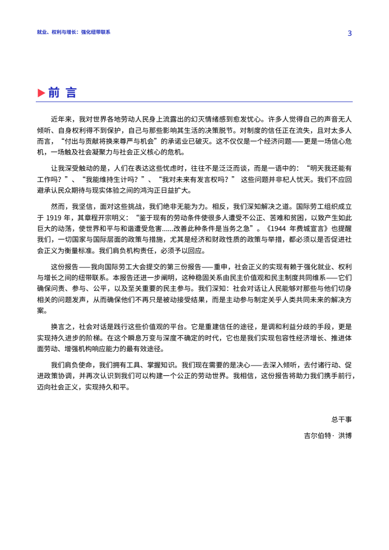这份报告——我向国际劳工大会提交的第三份报告—重申,社会正义的实现有赖于强化就业、权利与增长之间的纽带联系。本报告还进一步阐明,这种稳固关系由民主价值观和民主制度共同维系—它们确保问责、参与、公平,以及至关重要的民主参与。我们深知:社会对话让人民能够对那些与他们切身相关的问题发声,从而确保他们不再只是被动接受结果,而是主动参与制定关乎人类共同未来的解决方案。