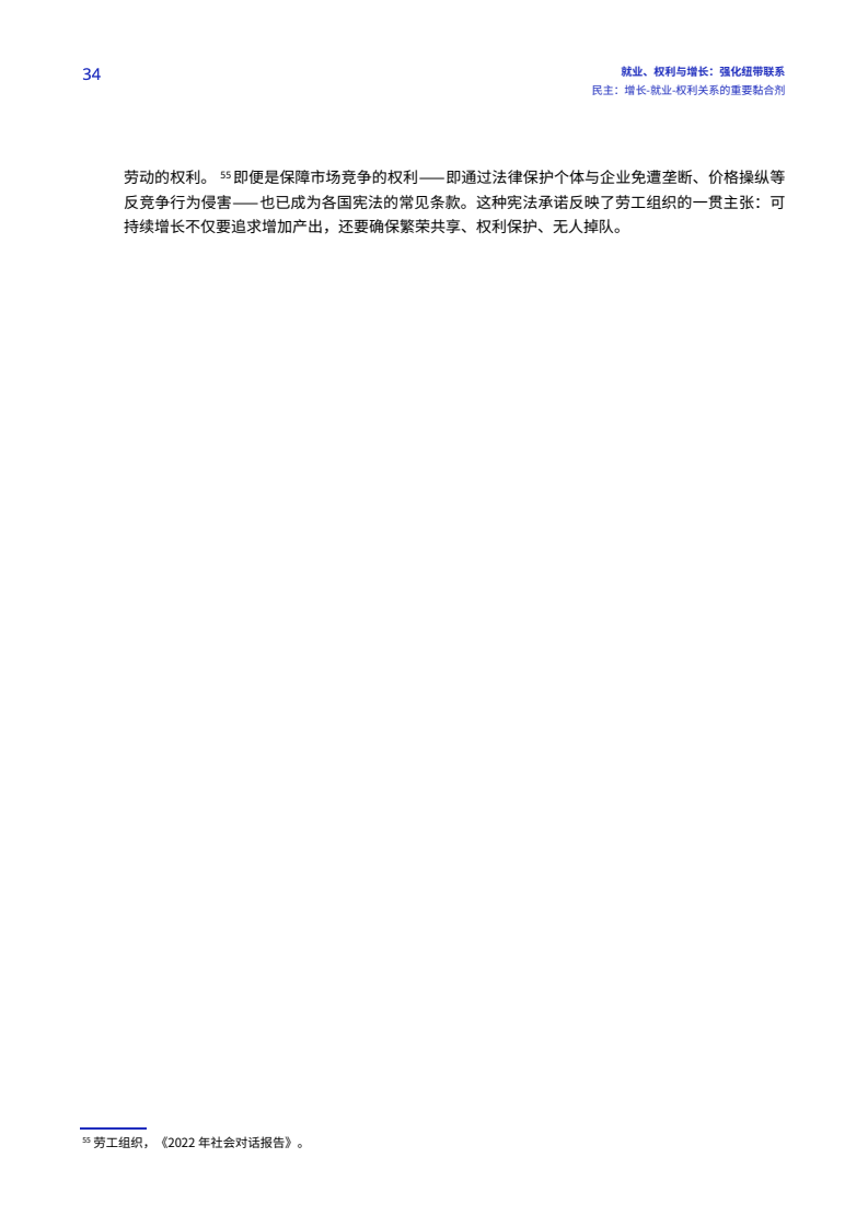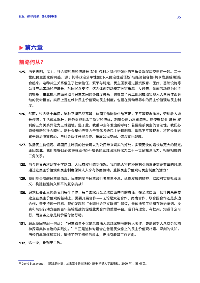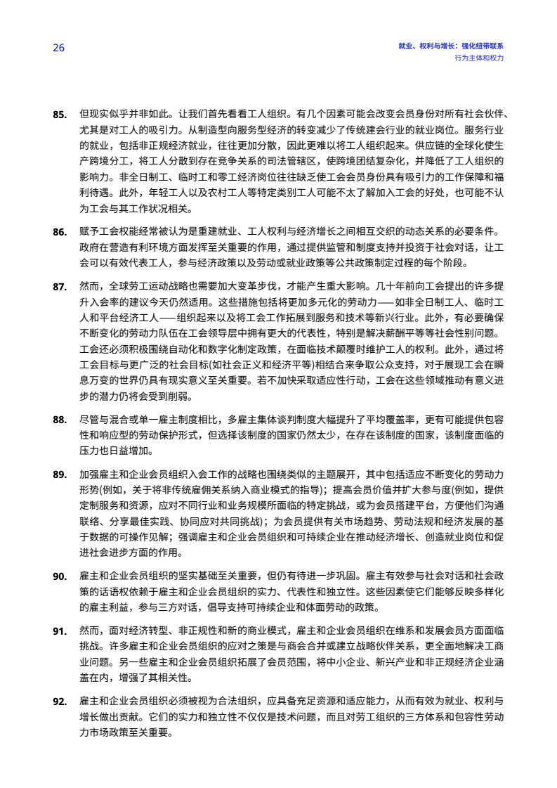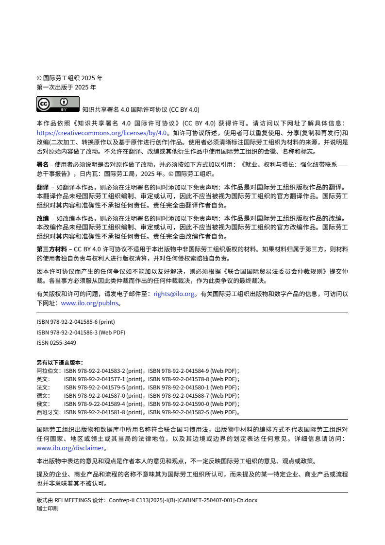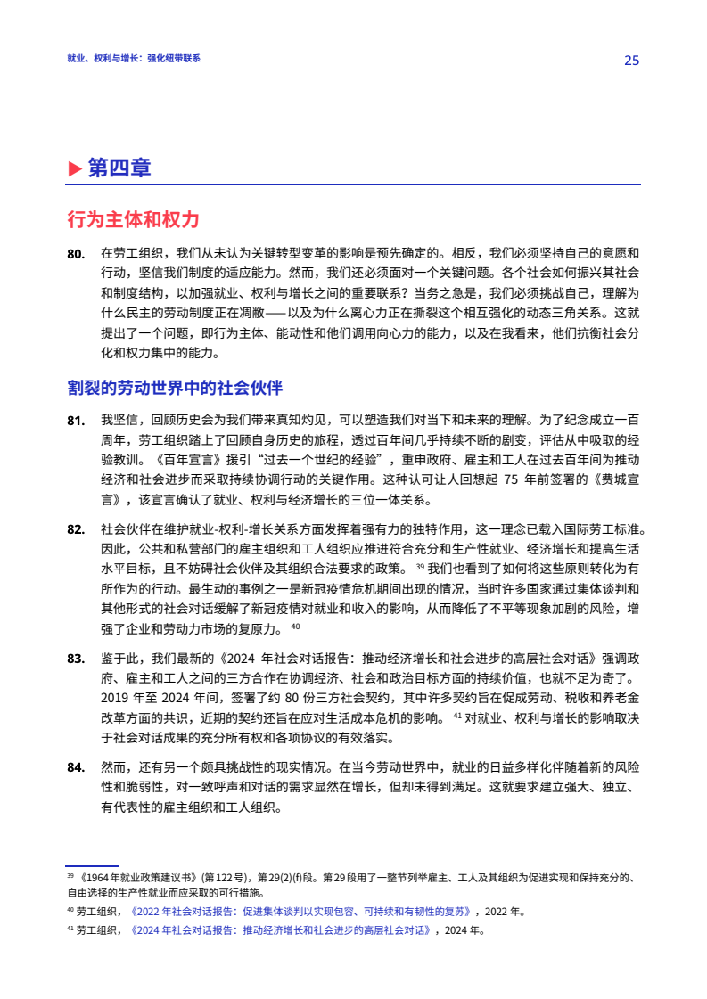 这份报告——我向国际劳工大会提交的第三份报告—重申,社会正义的实现有赖于强化就业、权利与增长之间的纽带联系。本报告还进一步阐明,这种稳固关系由民主价值观和民主制度共同维系—它们确保问责、参与、公平,以及至关重要的民主参与。我们深知:社会对话让人民能够对那些与他们切身相关的问题发声,从而确保他们不再只是被动接受结果,而是主动参与制定关乎人类共同未来的解决方案。