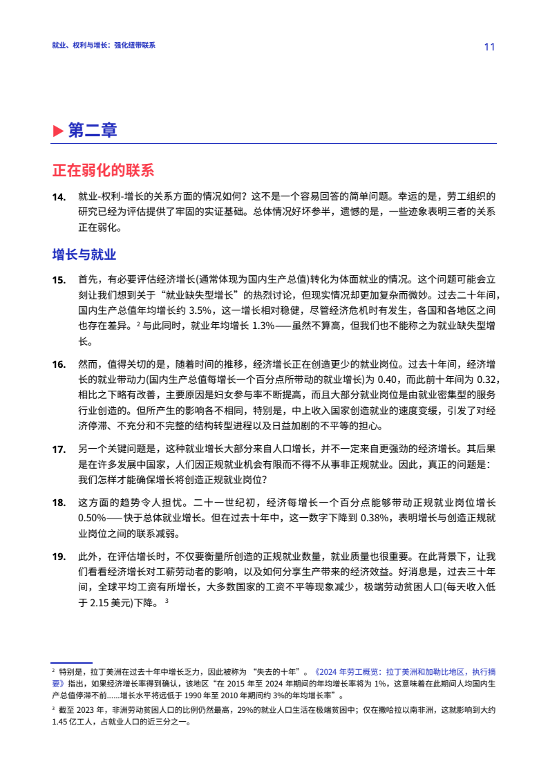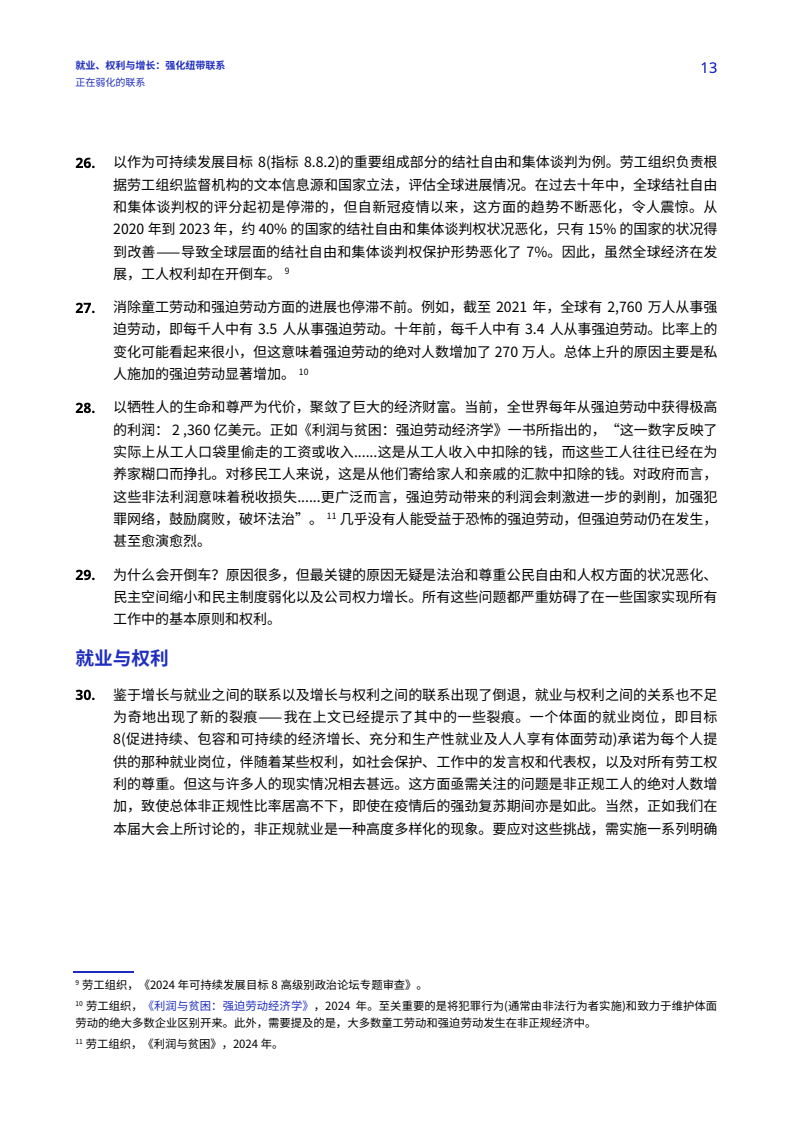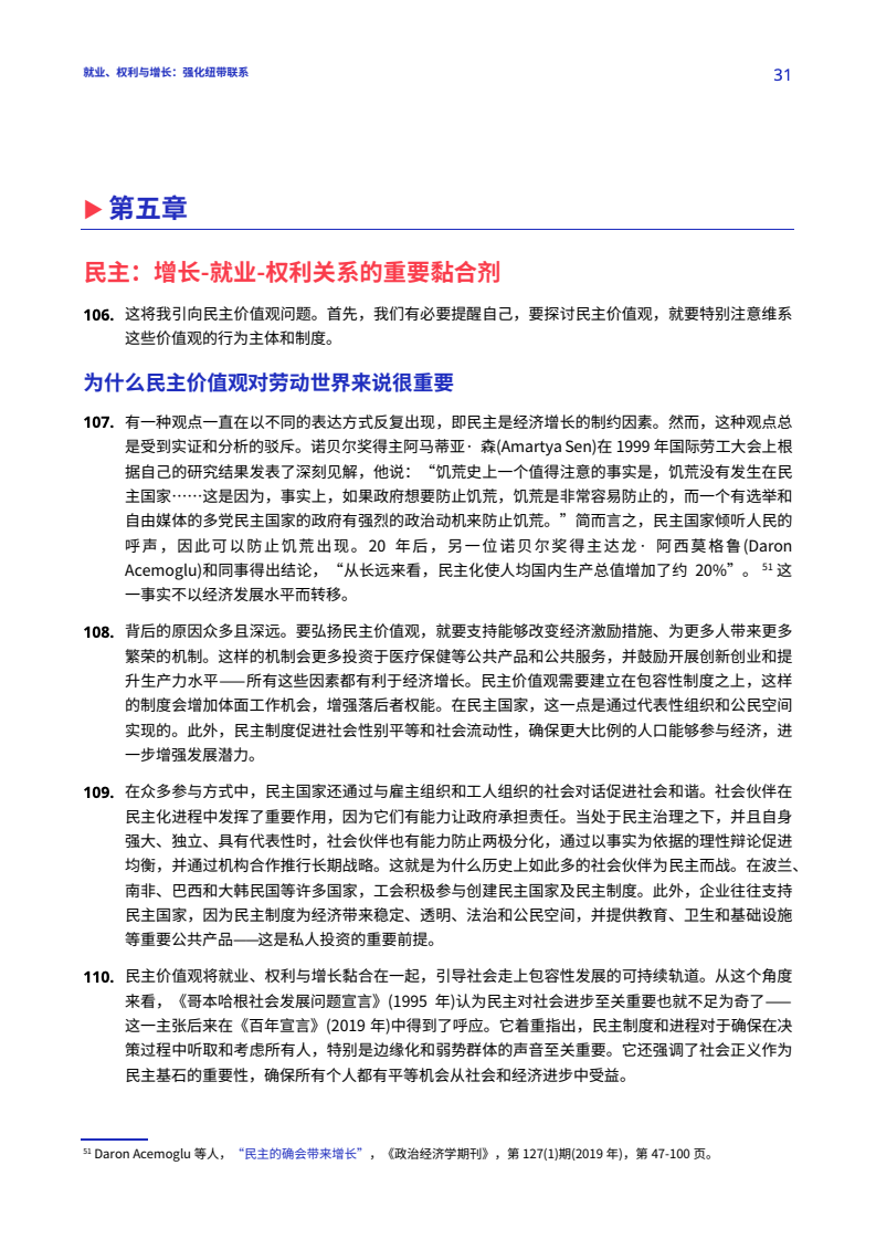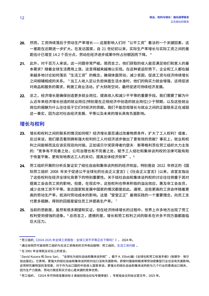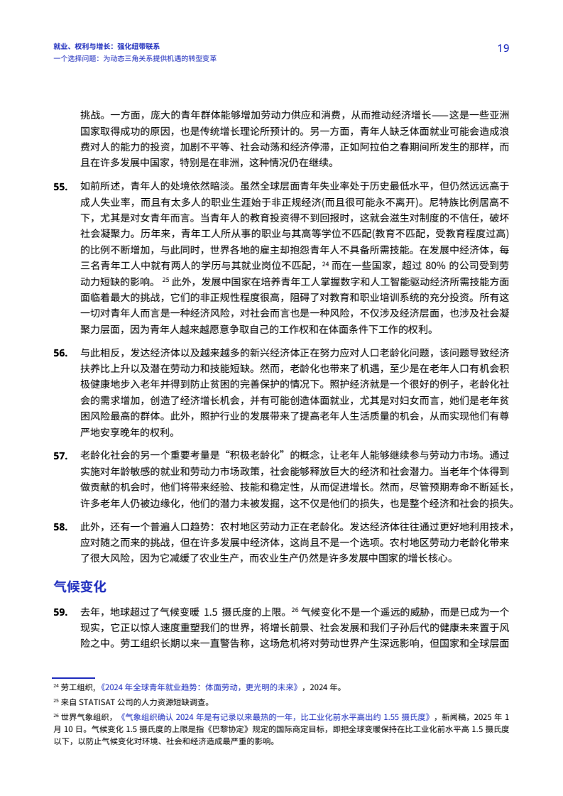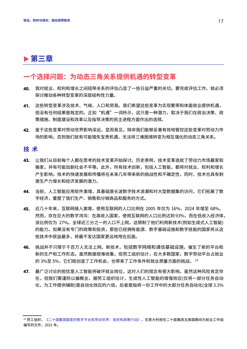 这份报告——我向国际劳工大会提交的第三份报告—重申,社会正义的实现有赖于强化就业、权利与增长之间的纽带联系。本报告还进一步阐明,这种稳固关系由民主价值观和民主制度共同维系—它们确保问责、参与、公平,以及至关重要的民主参与。我们深知:社会对话让人民能够对那些与他们切身相关的问题发声,从而确保他们不再只是被动接受结果,而是主动参与制定关乎人类共同未来的解决方案。