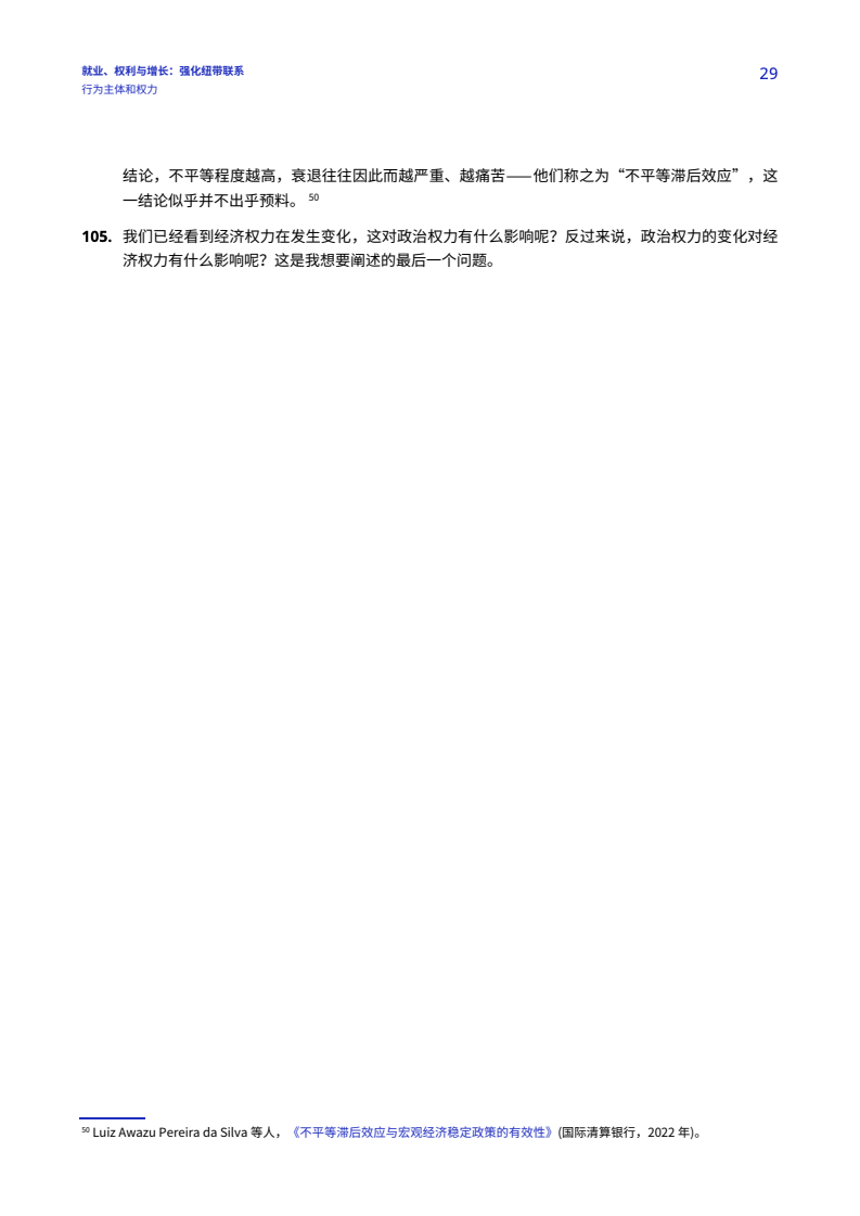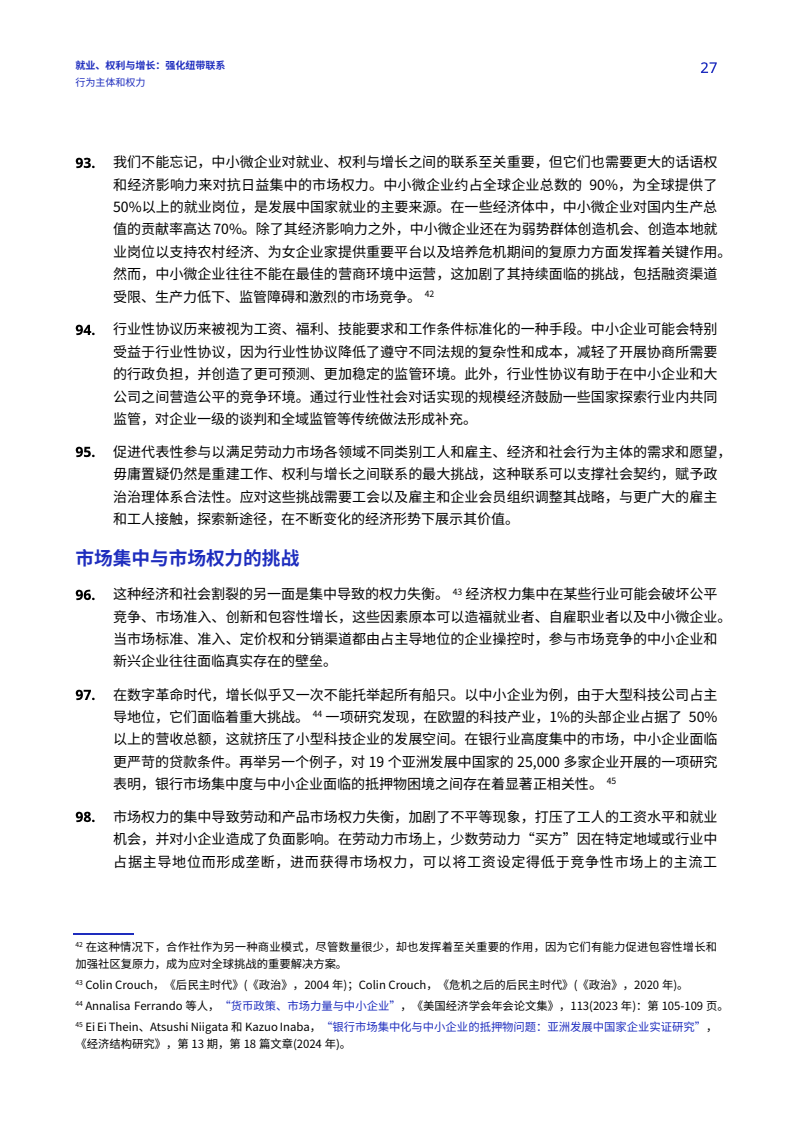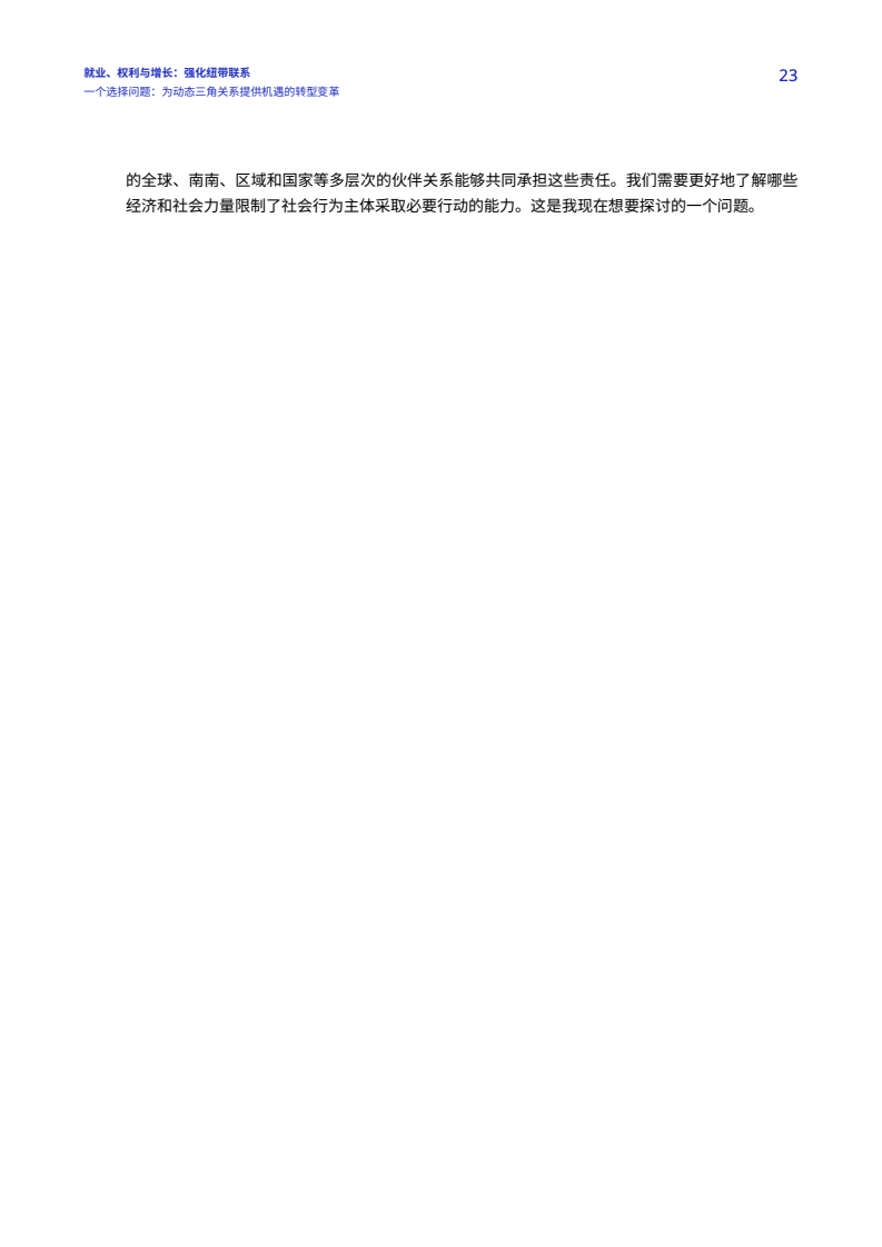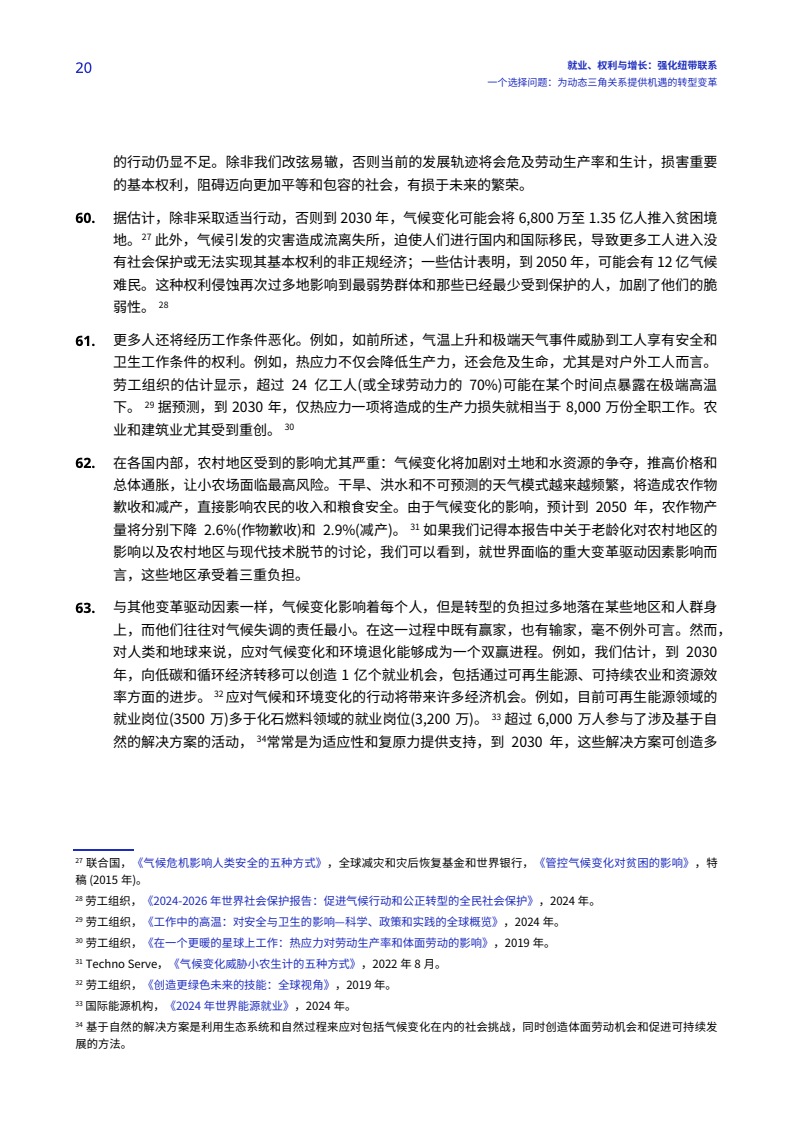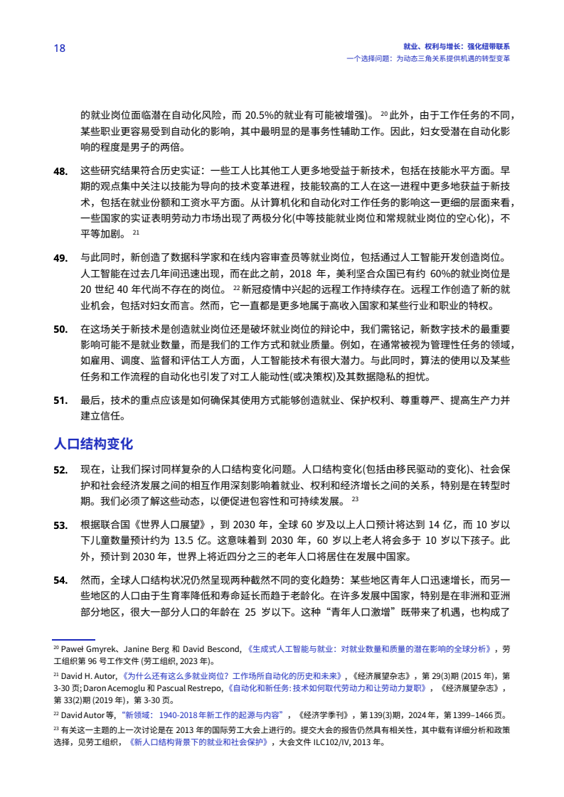 这份报告——我向国际劳工大会提交的第三份报告—重申,社会正义的实现有赖于强化就业、权利与增长之间的纽带联系。本报告还进一步阐明,这种稳固关系由民主价值观和民主制度共同维系—它们确保问责、参与、公平,以及至关重要的民主参与。我们深知:社会对话让人民能够对那些与他们切身相关的问题发声,从而确保他们不再只是被动接受结果,而是主动参与制定关乎人类共同未来的解决方案。