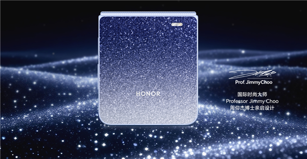 据了解,荣耀Magic V Flip2高定款由国际时尚大师周仰杰操刀设计,背板采用独特工艺打造出星空效果,带来如同水晶鞋上璀璨夺目的视觉效果。