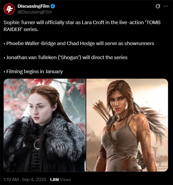 快科技9月4日消息,据媒体报道,亚马逊真人剧集《古墓丽影》宣布将于2026年1月19日开拍。