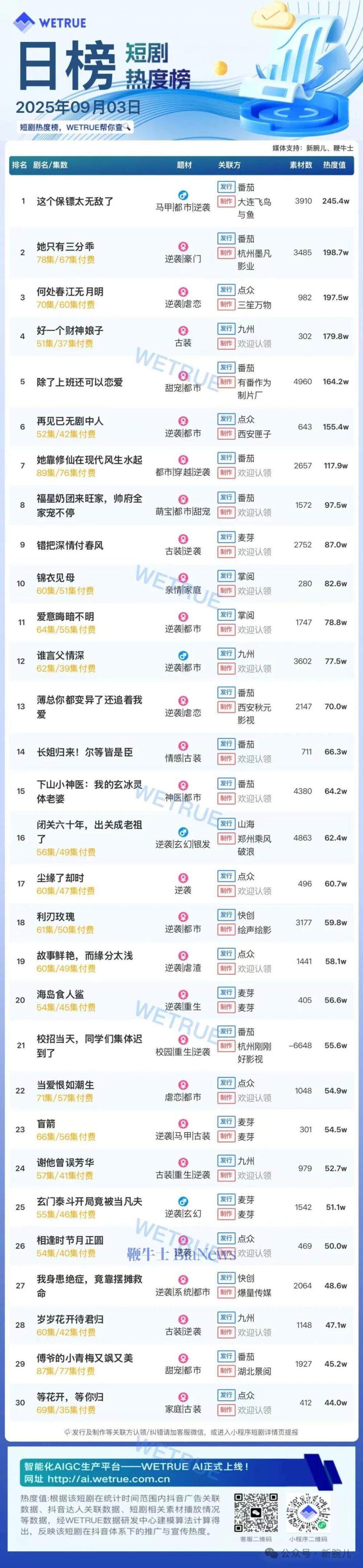 1、本日榜为WETRUE短剧数据公司提供,新腕儿和鞭牛士提供联合支持。