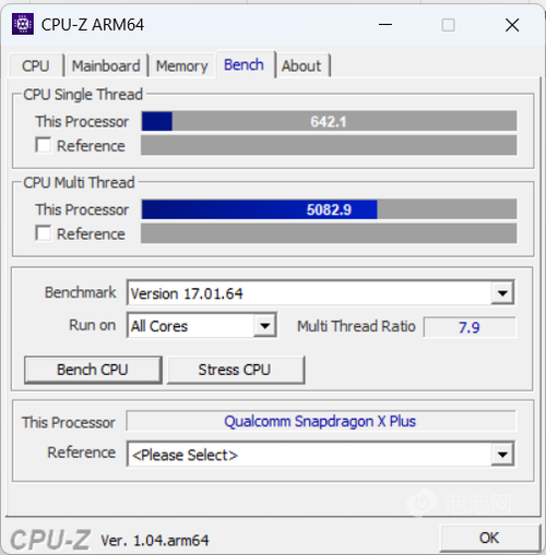 由于ARM架构的软件生态正在完善当中,可能有些软件并未完成原生开发,因此需要转译处理。我们也通过转译的方式来进行了CPU的测试,在X86版本的CPU-Z测试下,Snapdragon X Plus的单核成绩为457.5,多核成绩为3667.3。与ARM原生版本相比,性能下降了28%左右。