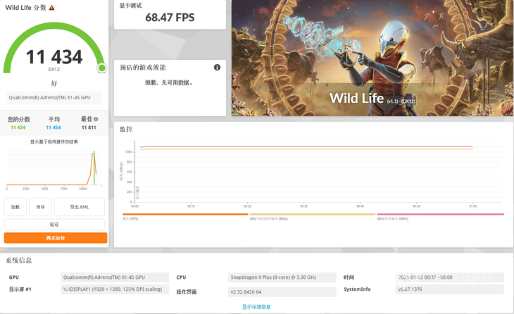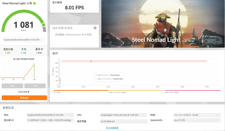 GPU方面,Surface Laptop, 13英寸配备的是Adreno GPU,目前3DMark并未推出ARM版本,所以在转译模式下,我们测试了Steel Nomad Light和Wild Life Extreme,成绩分别是1081和11434。