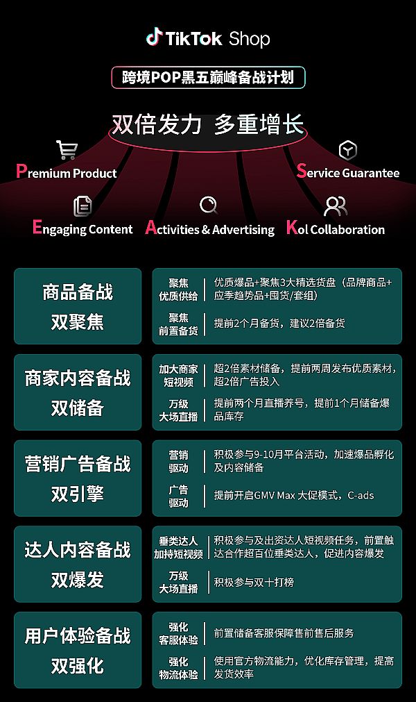 2025年黑五备战已经开启,为助力商家更好地“抢赢”黑五,本次大会围绕“商品、商家内容、营销广告、达人内容、用户体验”,重磅推出PEAKS黑五巅峰备战计划,并为平台商家提供了一份更加清晰的《TikTokShop跨境POP 2025黑五PEAKS备战秘籍》,助力商家轻松实现生意爆发。