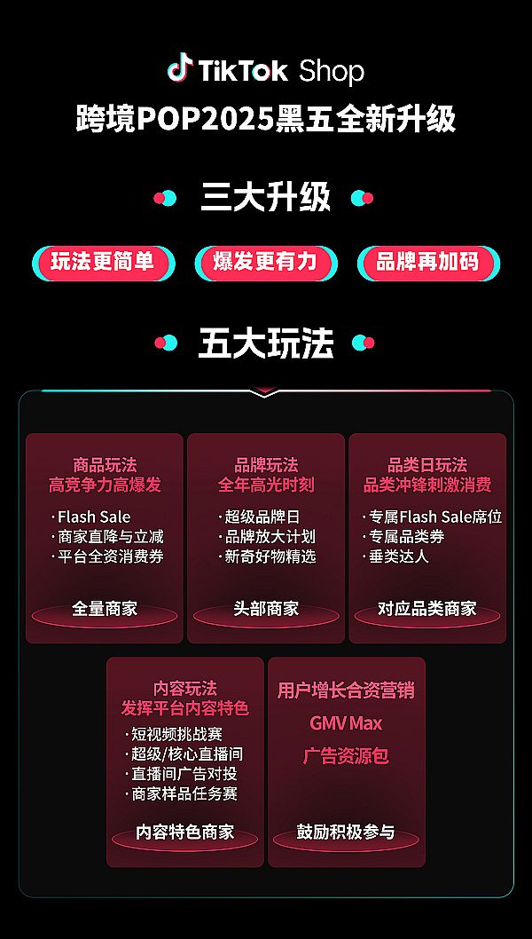 2025年“全球黑五”大促季,针对TikTok Shop跨境POP商家,平台宣布三大全新升级:玩法更简单、爆发更有力、品牌再加码,同时推出五大重磅玩法,助力商家实现全年生意破峰增长。