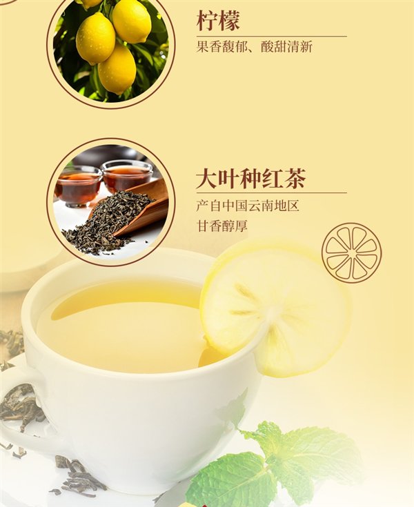 柠檬果香馥郁、酸甜清新;大叶种红茶,产自中国云南地区,甘香醇厚。