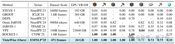 实验结果显示,在“获取钻石”完整链条上,VistaWise以33%成功率刷新非API类方法纪录,较前SOTA提升8个百分点,9个连续子任务全部达到73%以上的成功率。