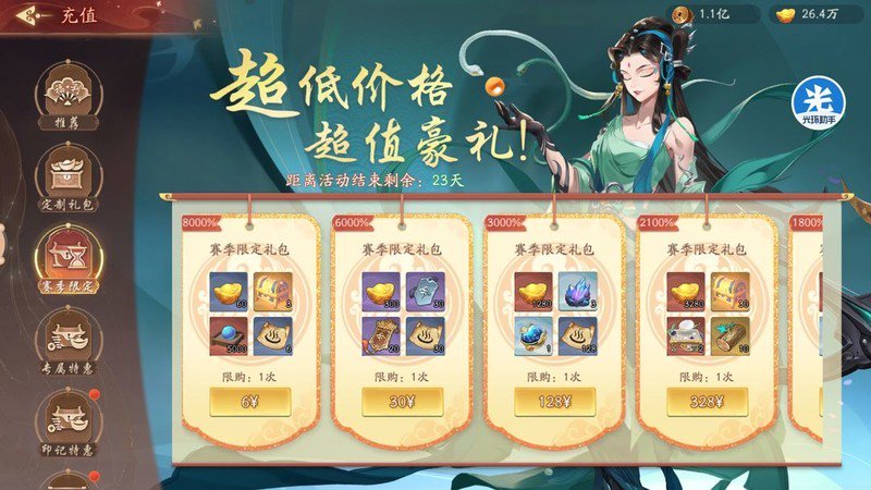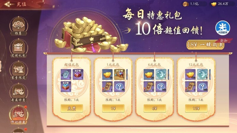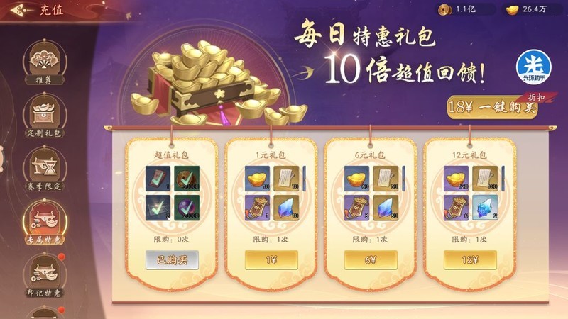 根据以往礼包经验,6元档位建议必买,18元和30元礼包中含有部分性价比较高的活动道具,30元还可获得6个初级元宝,68元中级元宝礼包也值得入手,而128元礼包则建议视个人需求决定是否购买。