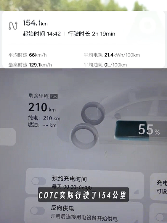 测试开始时,整辆车的油已经耗尽,剩余电量55%,表显CLTC续航210公里。