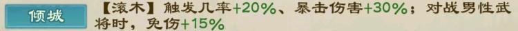 第二项天赋:滚木触发概率提升20%,暴击伤害增加30%。这项天赋是去年新增的,也是甄姬实力大幅提升的核心所在。虽然前期滚木效果并不明显,但在完成三合寻宝副本后,梨花扇可升至金色品质,进一步提升滚木10%的触发率,并且滚木攻击时可无视对方被动技能,且必定暴击。所谓无视被动技能,指的是像郭嘉的奇谋那样无视敌方被动效果,而荀彧的奇谋则不具备此类效果。在这种情况下,敌方步兵的后排免伤、辅助的暗谋以及军略类免伤技能都无法生效,相当于直接削减对方超过百点的免伤数值,大幅提高输出伤害。