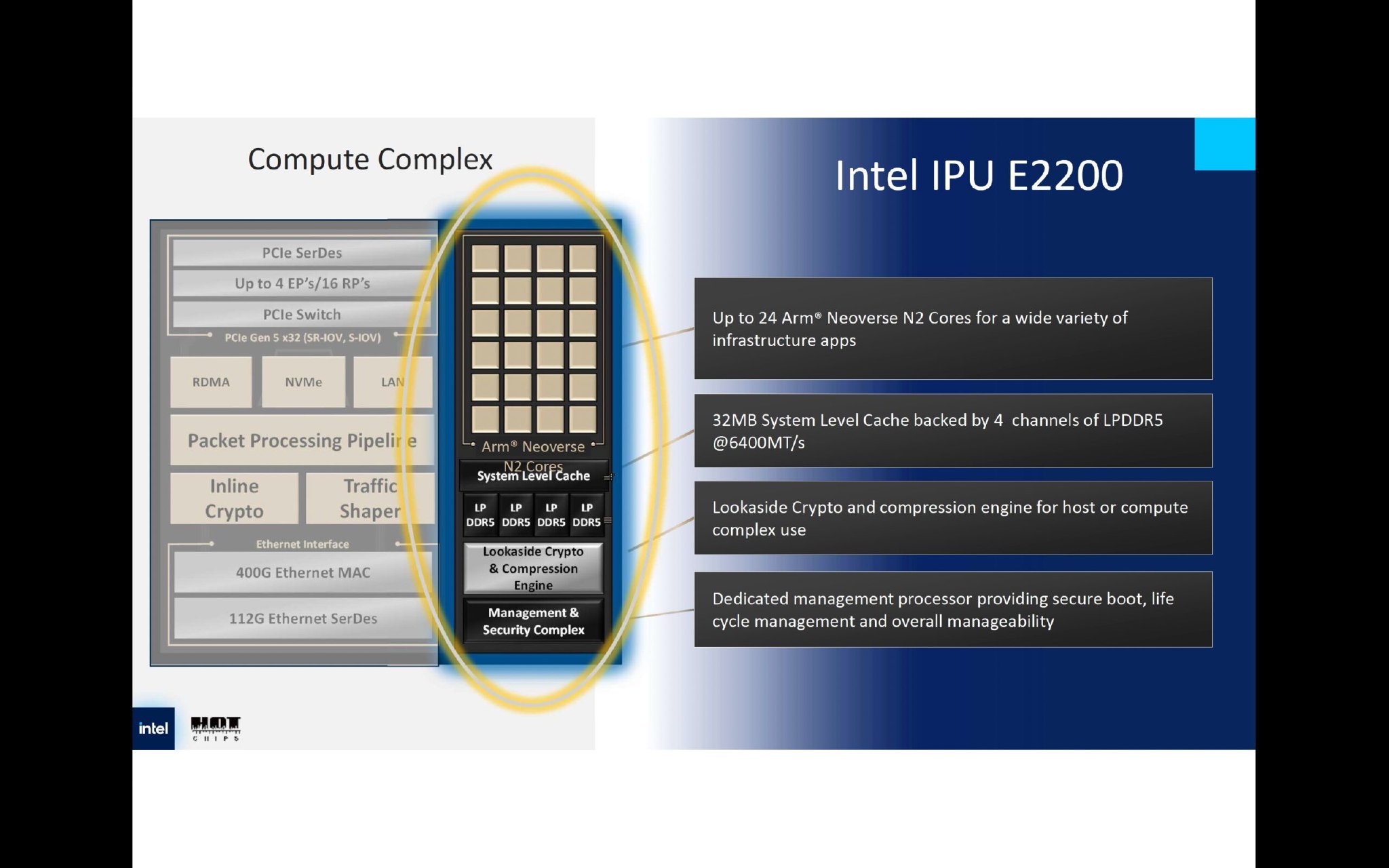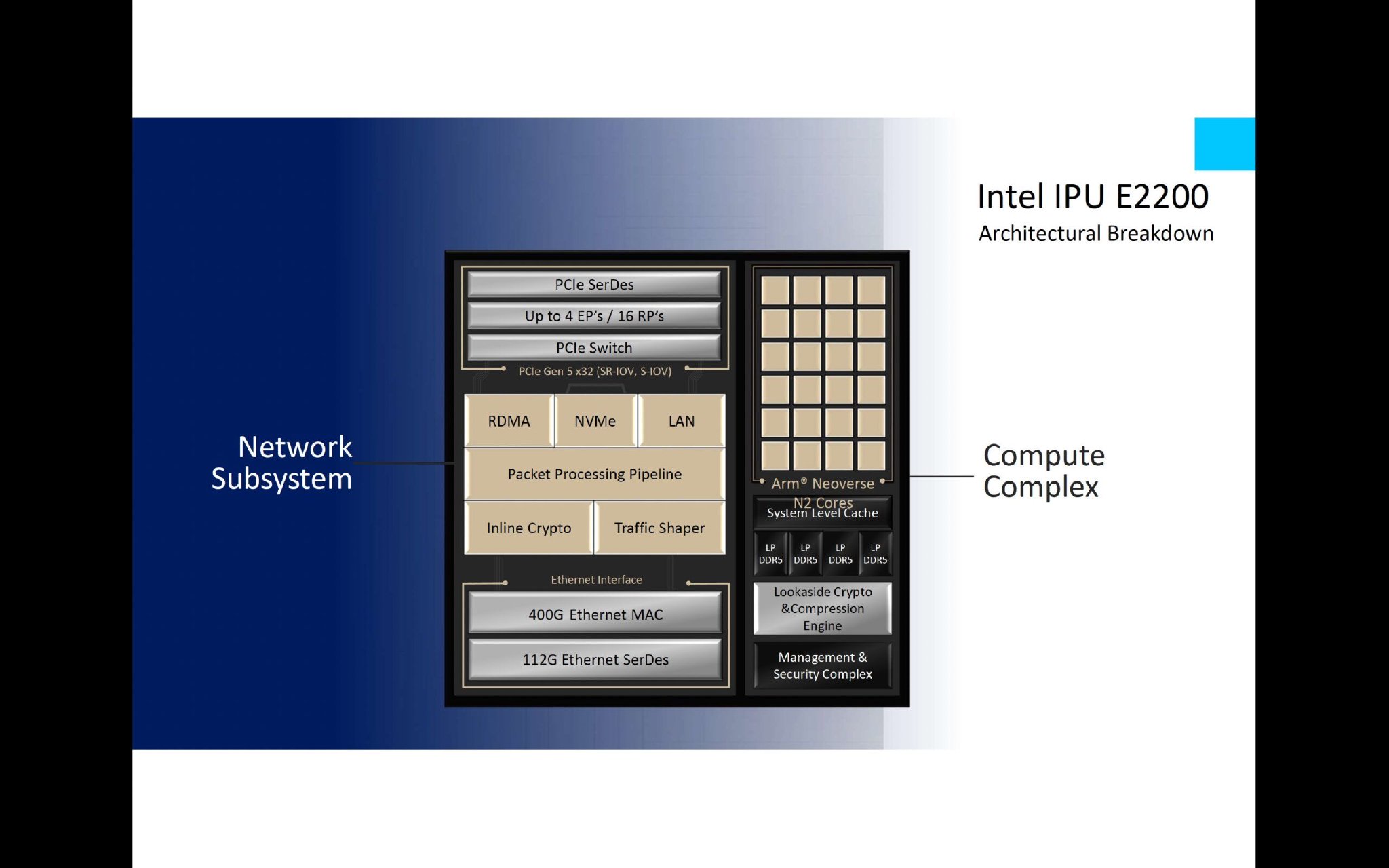 许多人心中的一个常见问题是,为什么英特尔选择在 E2200 中使用 Arm 内核而不是自己的 CPU。弗莱明解释说,这一决定是基于性能、可编程性和上市时间的考虑,而不是品牌忠诚度。对于这一代,Arm Neoverse N2 内核被证明是最合适的选择。未来的产品可能会根据要求采用不同的架构。