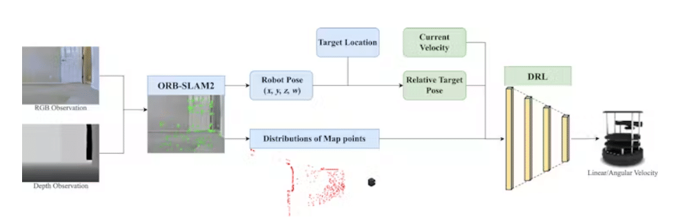 该系统利用 RGB-D 摄像头输入和 ORB-SLAM2(一种流行的视觉同步定位和映射算法)。该模型没有假设 ORB-SLAM2 总是成功,而是评估地图点的空间分布,将它们分组到角度扇区中,以衡量不同方向的视觉“安全”程度。机器人会因为选择富含视觉线索的路线而不是可能混淆地图系统的无特色走廊而获得奖励。