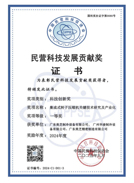 【广东,佛山】近日,中国民营科技促进会公布了“2024年度民营科技发展贡献奖”评审结果。由全球领先的暖通家电核心部件供应商GMCC美芝主导的“集成式转子压缩机关键技术研究及产业化项目”获得科技创新奖一等奖。此外,美芝参与的“深冷节能关键技术研究与应用项目”、“积木式热泵低环温高效清洁制热关键技术研究及应用项目”两项目也获得科技创新奖一等奖。该奖项也是国内唯一以民营企业为主体,涵盖所有行业及细分领域的社会力量科学技术(创新)奖。美芝在空调、热泵用压缩机、冰箱用压缩机领域的技术研发能力再次获得认可。