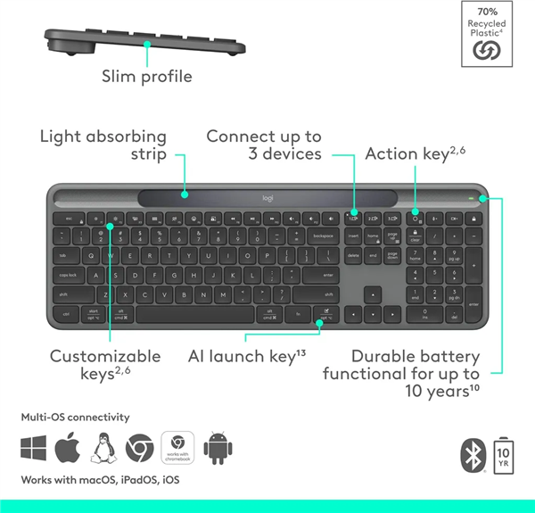 与罗技的其他键盘一样,Signature Slim Solar+可以与多达三台设备配对,并通过一个按键切换,通过Logi Options+应用程序,用户可以自定义键盘上的按键。