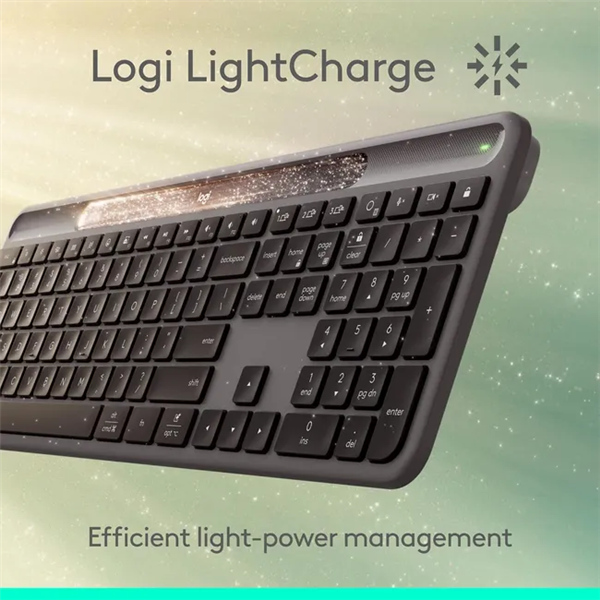 Signature Slim Solar+的设计与MX Keys S相似,但在键盘顶部增加了一块太阳能电池板,这块窄窄的太阳能电池板可以吸收自然光或人造光,因此即使在阴雨天也不用担心电量问题。
