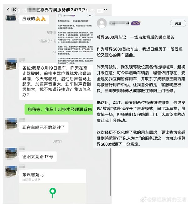 车主表示,昨天驾驶时,自己发现驾驶位莫名传出嗡嗡声,起初并未在意;可今早启动车辆后,噪音依旧存在,安全起见立刻暂停用车,并联系了成都惠王陵西路鸿蒙智行用户中心。