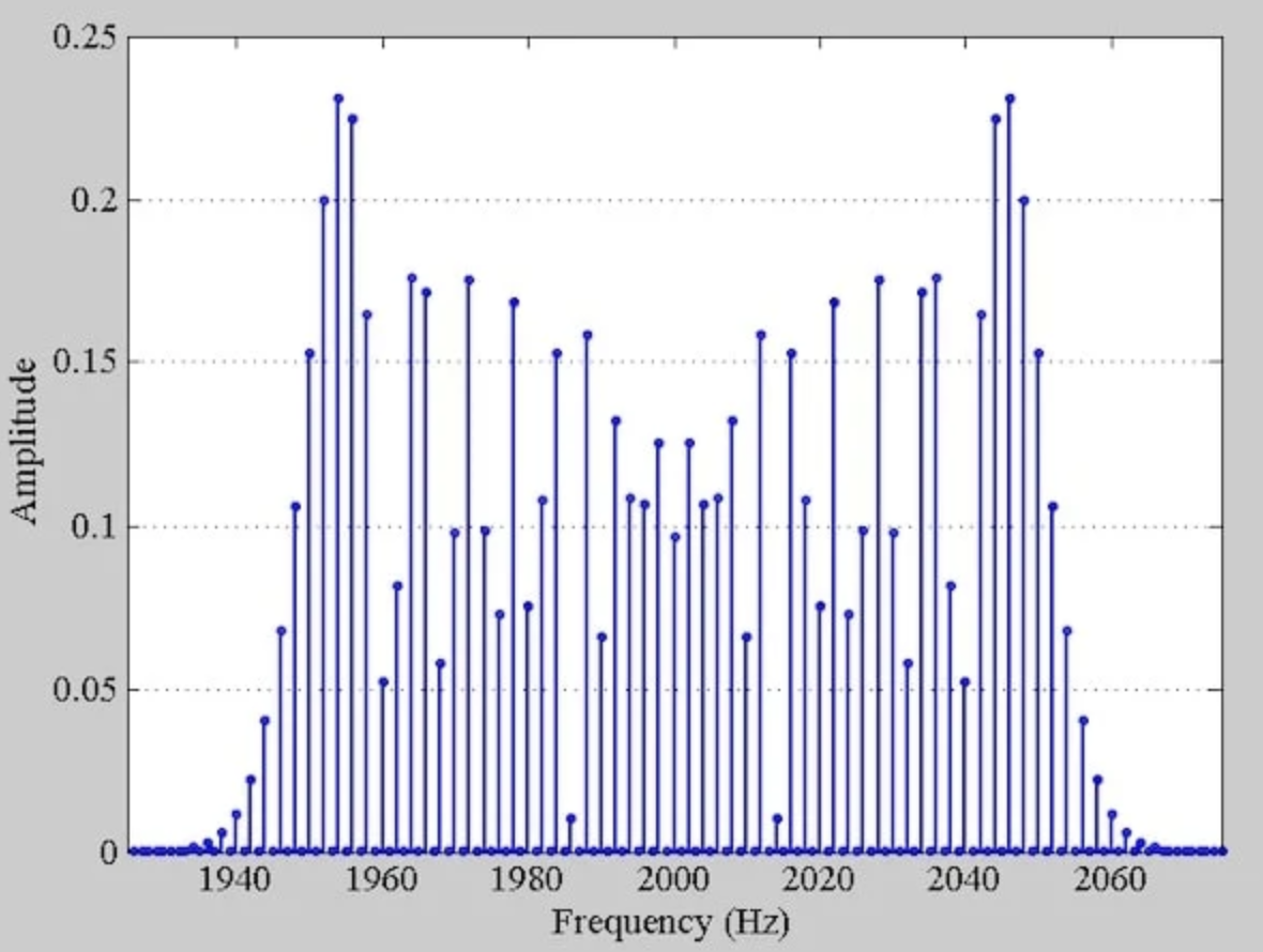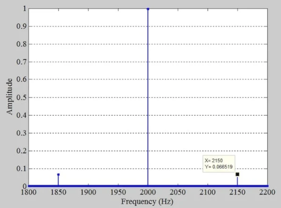 这接近于我们从窄带调频分析中预期的 2fm = 300 Hz 的值。