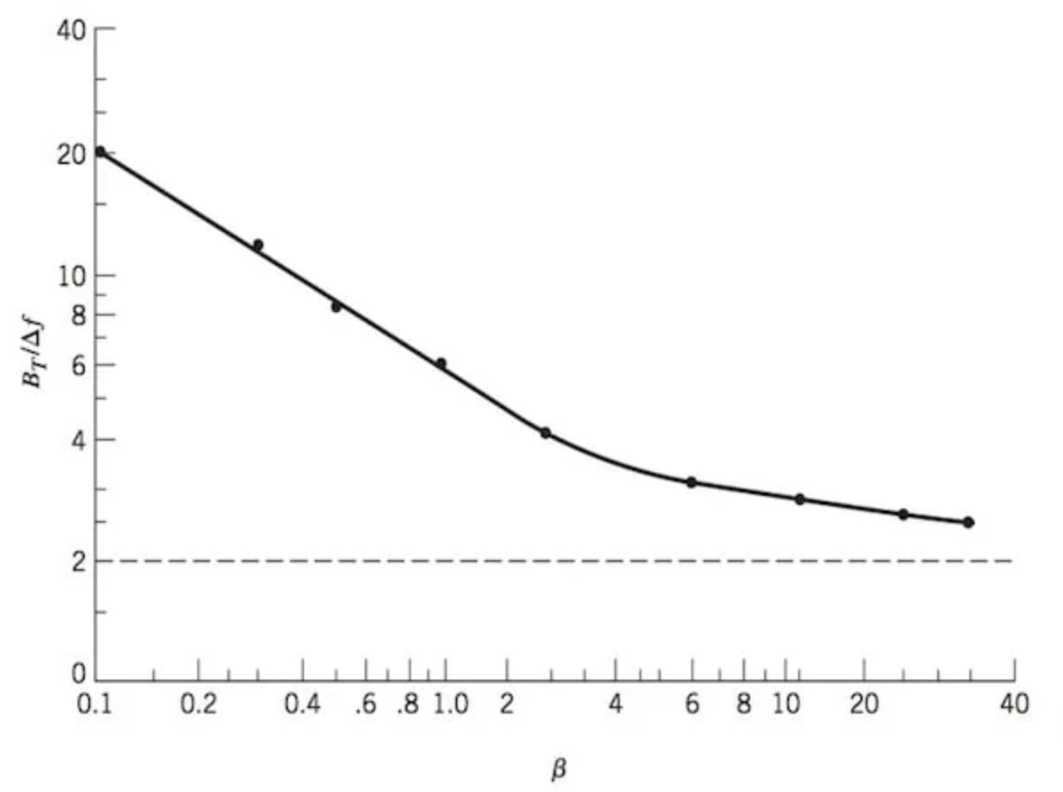有趣的是,如果我们考虑不同β值下 FM 波 98%或更多功率的带宽,我们会发现显著边带的数量始终为 N = β + 1。这就是卡森规则。