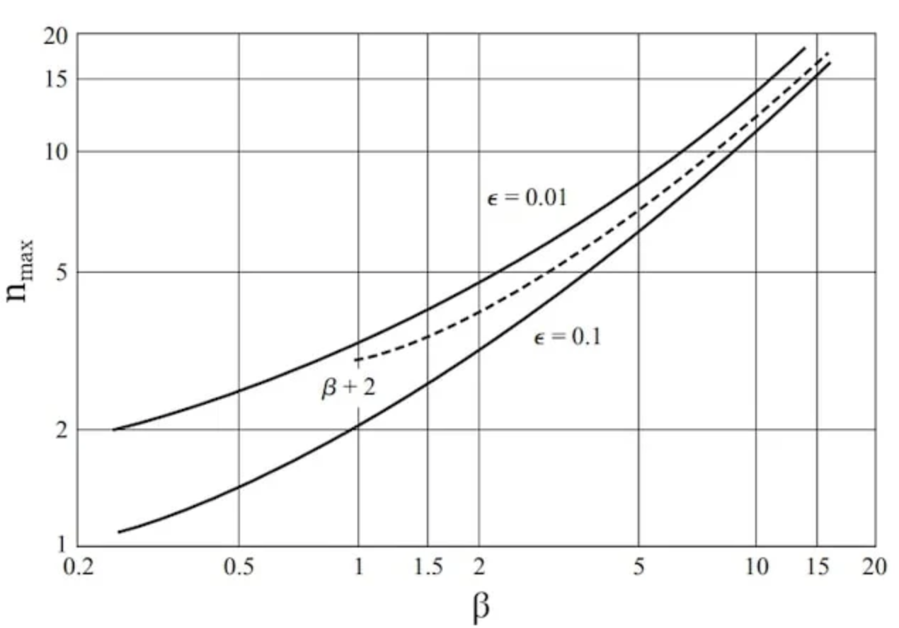 在这种情况下,我们知道 nmax 取决于 D。我们不必使用曲线和表格来确定 nmax,而是可以通过将β替换为 D 并将 fm 替换为 W 来应用卡森规则: