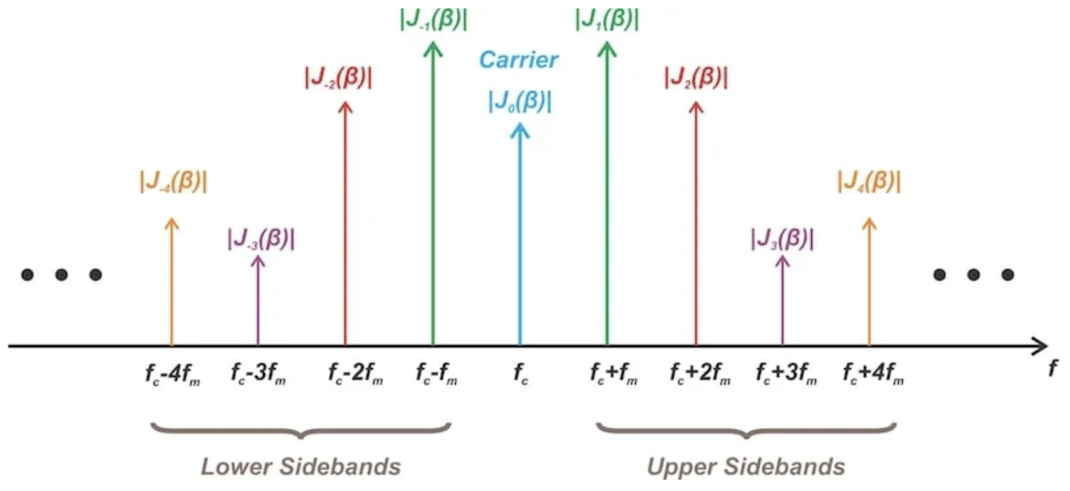 在本系列的早期,我们深入探讨了由单频消息信号(也称为调频波)产生的调频波频谱。正如我们所学,这个频谱由无限多个边带组成。然而,只有有限数量的这些边带包含显著的功率。在确定传输信号所需的带宽时,只需要考虑显著的边带。