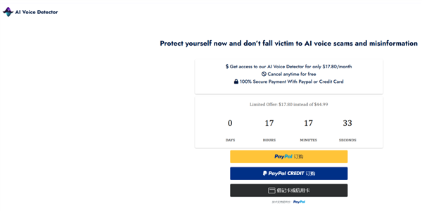 我们最先找到的是这个叫 AI Voice Detector 的网站,在没有任何免费试用,效果未知的情况下,检测 AI 声音的价格最低是一个月 17.8 美元。