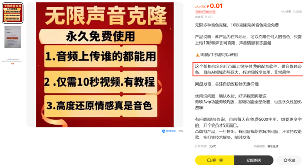 商品详情页普遍打着 “ 只要 x 秒样本、相似度高达 90%+、定制任何语音、情感高度还原 ” 等等宣传语,点进去就是一波焦虑营销,号称是做自媒体必备。