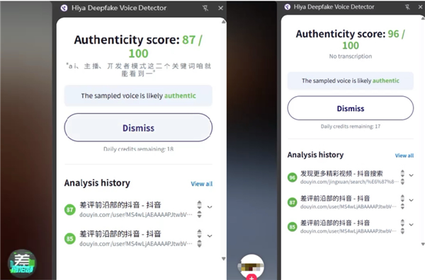 我们用浏览器插件 Hiya 测了前沿部江江的真人配音和大饼的 AI 配音,结果 AI 得分 96,真人配音 87,小丑竟是我自己啊。