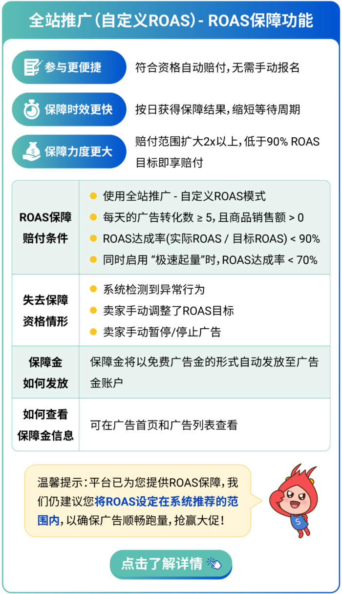 ROAS保障,旨在鼓励卖家在全站推广(自定义ROAS模式)广告活动中实现更稳定的表现。当实际ROAS(投产比)低于某一阈值,且满足ROAS保障条件时,卖家将自动获得以免费广告金形式充值的保障金。这一扶持政策商家无需手动报名即可享受。