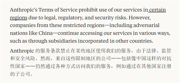 Anthropic表示,这一决定背后的原因涉及法律、监管和安全风险。此外,Anthropic还担心这些公司可能会利用模型技术推进自身的AI,并与美国及其盟国的科技公司在全球展开竞争。