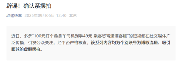 快科技9月5日消息,今日,认证主体为“滴滴出行(北京)网络平台技术有限公司”的公众号“辟谣快车”发文,对网络传播的多条“100元打个桑拿车司机到手49元 乘客怒骂滴滴客服”的短视频进行辟谣。