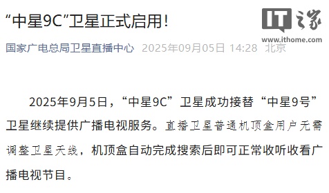 9 月 5 日消息,国家广播电视总局宣布,“中星 9C”卫星今日正式接替服役多年的“中星 9 号”卫星,继续为全国用户提供广播电视服务,用户无需调整设备即可正常接收信号。