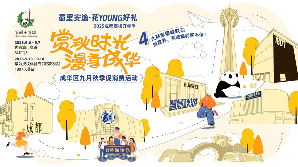 “四维主题”精准触达,情感共鸣强烈。活动围绕“开学有新”“师恩有礼”“换季有品”“秋游有型”四大主题,精准匹配不同群体需求: 优客城市奥莱以“开学新风尚”唤起青春记忆,聚焦学生与家庭群体;SM百货以“师恩如光”传递感恩温情,覆盖教师群体及心怀校园回忆的市民; 华为授权体验店(东郊记忆)与1807天荟店分别以“智慧秋游”和“潮流成华”吸引年轻及家庭客群,融入科技与城市文化元素。通过情感共鸣增强消费意愿,实现“人有所获、心有所感”。