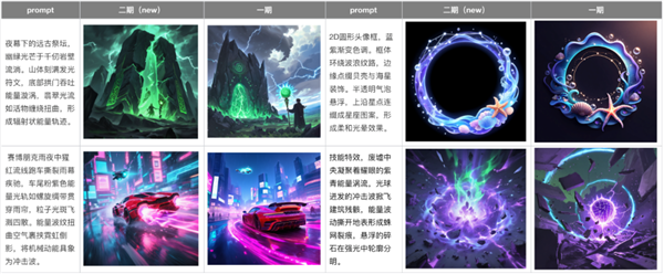升级后的模型在美学与构图方面有所提升,更契合游戏美术创作需求,针对游戏独有的场景,如技能特效、环境特效、游戏交互界面(游戏徽章、按钮、技能图标等)进行优化,能更出色地生成游戏场景、道具物品和角色等内容。