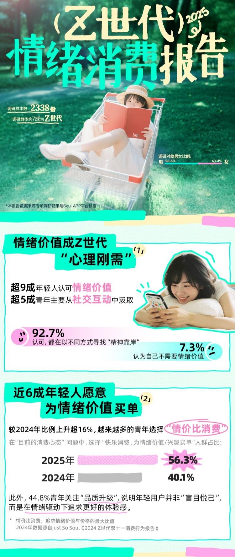 据介绍,该报告收到了2338份有效反馈问卷调研,受访对象中Z世代占比约7成。其中,超9成青年认可“情绪价值”,并以不同方式寻找“精神靠岸”。