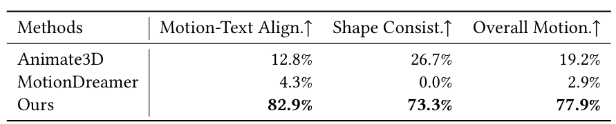 团队将 AnimaX 与众多优秀的开源模型进行定性定量的对比。可以看到 AnimaX 的结果基本都优于现有方法,并在后续的人类偏好测试中取得了显著优势。