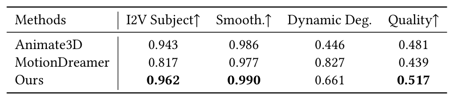 团队从 VBench 中选取了四个指标进行评测,包括主体一致性(I2V Subject)、运动平滑度(Smooth)、动态程度(Dynamic Deg.)和外观质量(Quality)。