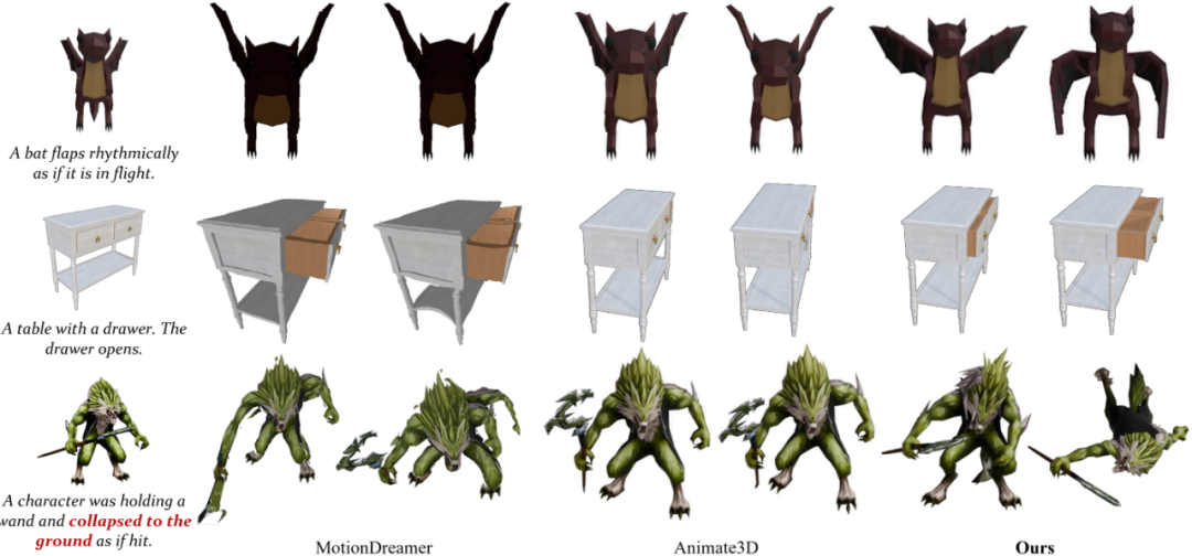 相比之下,MotionDreamer 依赖预训练视频扩散模型来监督模型形变,但由于形变场的自由度过高,约束能力有限,往往导致几何不一致和时序不稳定;Animate3D 则通过微调多视图视频扩散模型提升跨视角一致性,虽然在一定程度上减少了伪影,但重建过程困难,常出现几乎静止的结果。